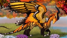 Today’s wonderful dragon art is called A Dragon Meeting by American professional artist Amanda Mullins. I love the design of her horns and the lionfish-like spines down her back, and her loooooooong (quite ridiculously long, actually) tail! The artist says she was “trying to do something with more detail in the background,” and I think she succeeded beautifully. Amanda…